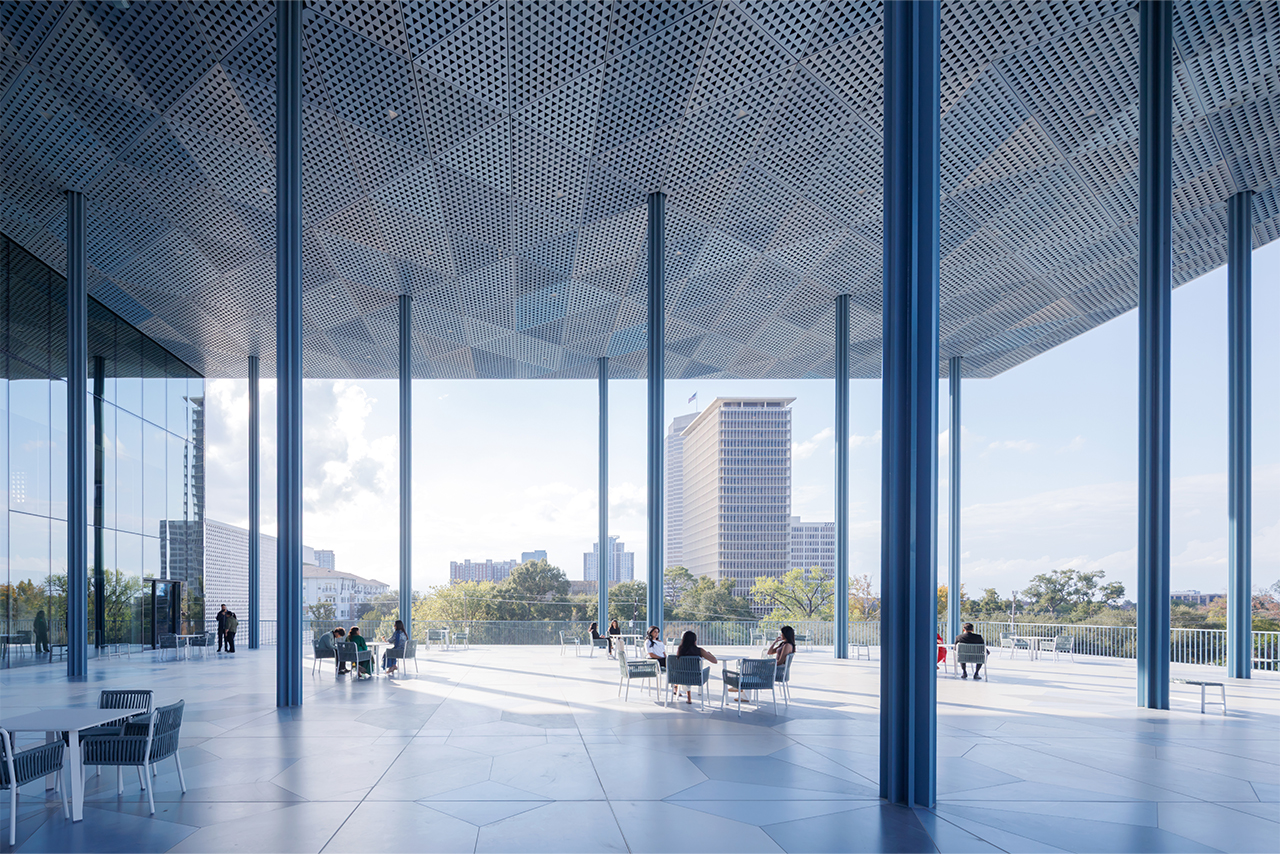The building is designed with a compact footprint, leaving large portions of the site to be used as gardens. Given the frequently hot and humid climate of Houston and the prominence of the site in the city, it is designed with a tripartite form with each of its volumes hosting a soaring eivan (veranda) to enable social and cultural gatherings to occur outdoors throughout the year. The eivans are supported by forty-nine slender columns reminiscent of those used in Persepolis and seventeenth century palaces in Isfahan, Persia. In being open on all sides and visible from all approaches to the site, the eivans will make the Ismaili Center open and inviting in every direction. At night, they will transform it to a beacon of light along Montrose Boulevard and Allen Parkway.